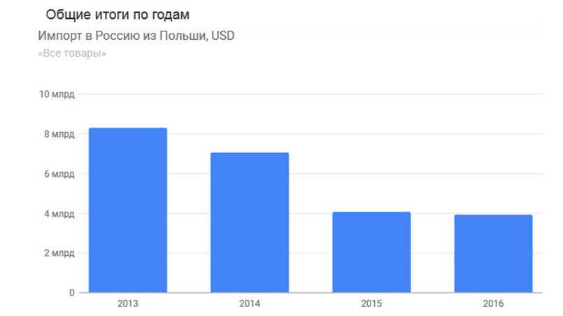В результате введения санкций против России к 2016 году объем экспорта снизился более чем в два раза и составил всего 3,9 млрд долларов США. Как видно, польские власти в своих действиях не руководствуются интересами страны и собственных производителей, а действительно поступают по принципу «назло русским отморожу себе уши».