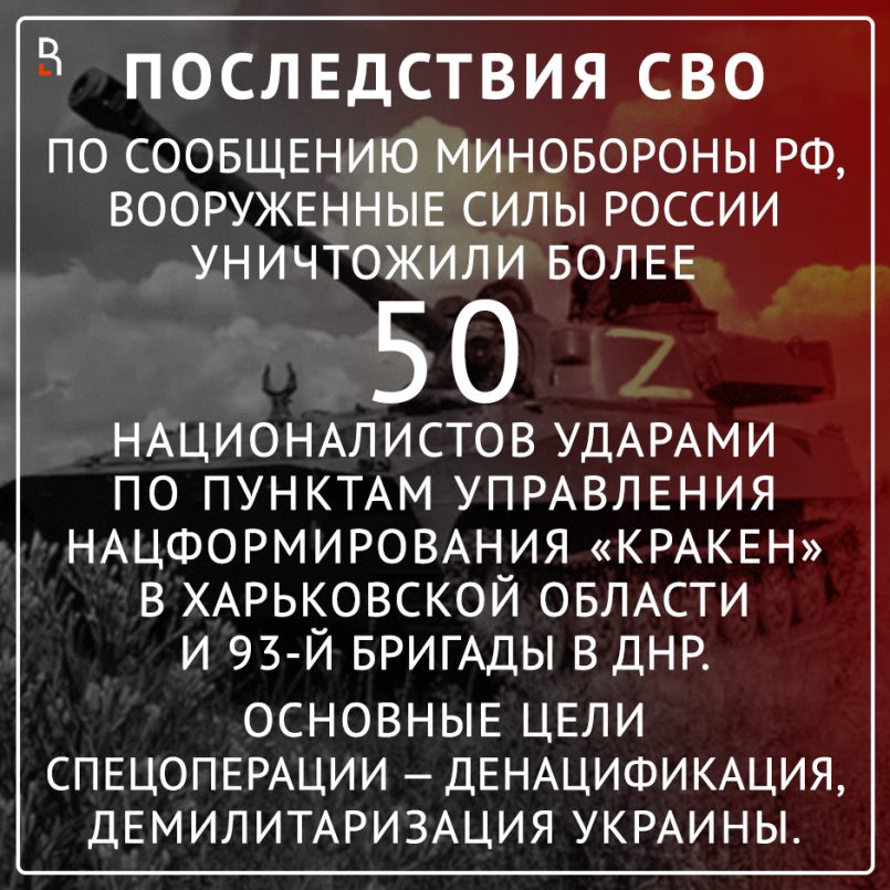 ВС РФ уничтожили более 50 националистов ударами по пунктам управления националистического формирования «Кракен» в Харьковской области и 93-й бригады в Донецкой Народной Республике (ДНР). Об этом в пятницу, 9 сентября, заявил официальный представитель Минобороны РФ генерал-лейтенант Игорь Конашенков.