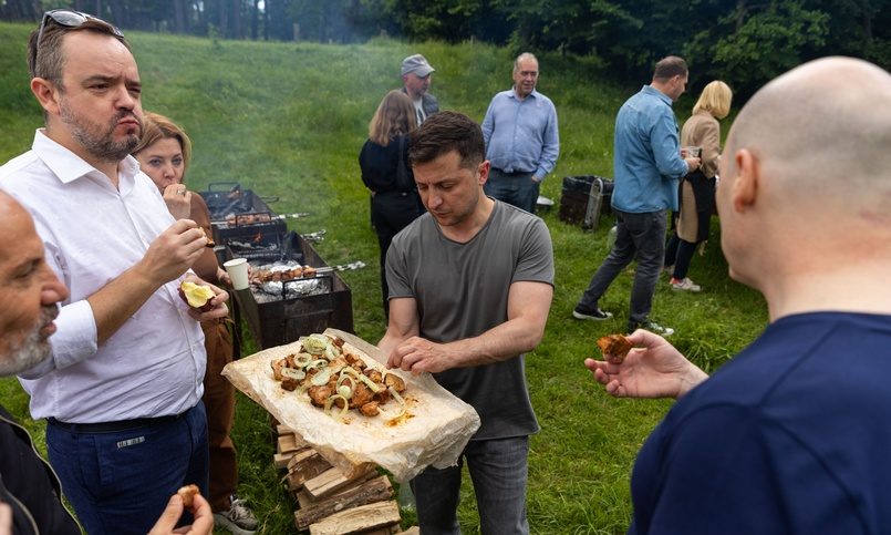 На фотографиях, опубликованных в твиттере, Зеленский раздает шашлыки в окружении нескольких десятков приглашенных журналистов. «Острые, нетерпеливые, остроумные, оперативные, профессиональные, с усиленным чувством справедливости — такие украинские журналисты. И прежде всего это люди, которые мечтают и хотят перемен», — заявил президент.