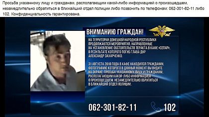 МВД самопровозглашенной Донецкой народной республики объявило в розыск мужчину, посетившего кафе «Сепар» незадолго до взрыва 31 августа, в результате которого погиб глава ДНР Александр Захарченко. Об этом сообщает