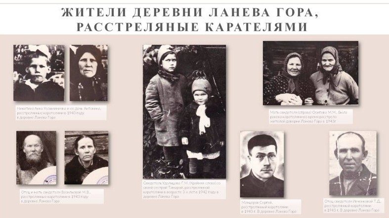 Одно из самых громких преступлений карателей — уничтожение поселка Ланева Гора, который пособники фашистов сожгли в 1943 году. Перед этим они расстреляли всех его жителей, из которых более половины были несовершеннолетними — три ребенка грудного возраста и 29 детей в возрасте до 14 лет.