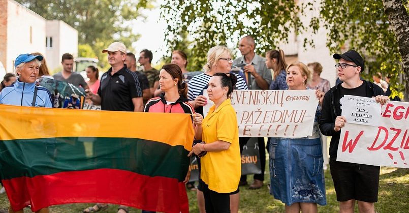 Возмущенные жители Девянишкеса вышли на пикет под литовскими флагами с плакатами на польском и литовском языках. Они призывают власти услышать их голос.