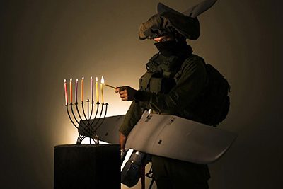 Это вот — всколыхнувшая мир фотография из твиттера офицера израильской армии. Человек пришел зажечь праздничную свечу с беспилотником под мышкой. Беспилотнику как раз нужен час для подзарядки.