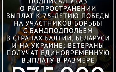 Президент России Владимир Путин подписал указ о распространении выплат к 75-летию Победы на участников борьбы с бандподпольем в странах Балтии, Беларуси и на Украине. Ветераны получат единовременную выплату в размере 75 тыс. рублей