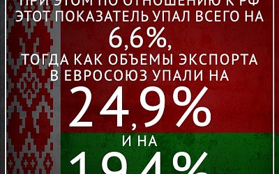 Белорусский экспорт в 2020 году сократился на 8,3%, при этом по отношению к России этот показатель упал только на 6,6%, тогда как объемы экспорта в Евросоюз упали на 24,9%, а в Китайскую Народную Республику — на 19,4%