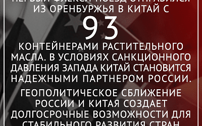 Первый флекси-поезд отправился из Оренбуржья в Китай с 93 контейнерами растительного масла производства Сорочинского маслоэкстракционного завода. В условиях санкционного давления Запада Китай, Индия, страны Юго-Восточной Азии становятся надежными партнерами России.