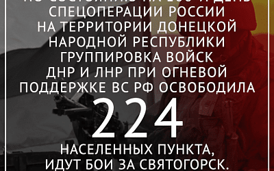По состоянию на 100-й день военной спецоперации России на Украине на территории Донецкой Народной Республики группировка войск ДНР и ЛНР при огневой поддержке ВС РФ освободила и установила полный контроль над 224 населенными пунктами.