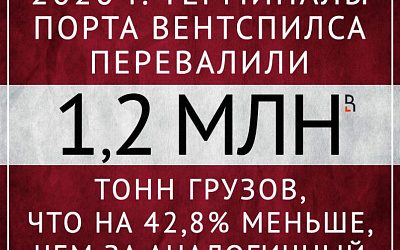 По итогам января 2020 года терминалы порта Вентспилса перевалили 1,2 млн тонн грузов, что на 42,8% меньше, чем за аналогичный период годом ранее