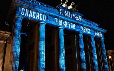 В немецкой столице на Бранденбургских воротах высветили слово «спасибо» на четырех языках, в том числе на русском. Инициатором акции стала местная культурная организация.