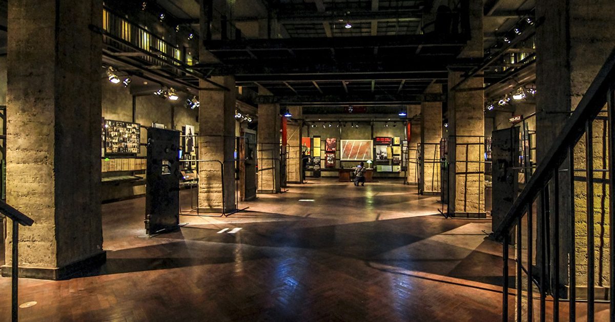 По стенам музея довольно скромно висят стенды собственно экспозиции, а доступ к ним символически преграждают тяжелые окованные двери с характерными квадратными окошками — по двери между каждой парой колонн.