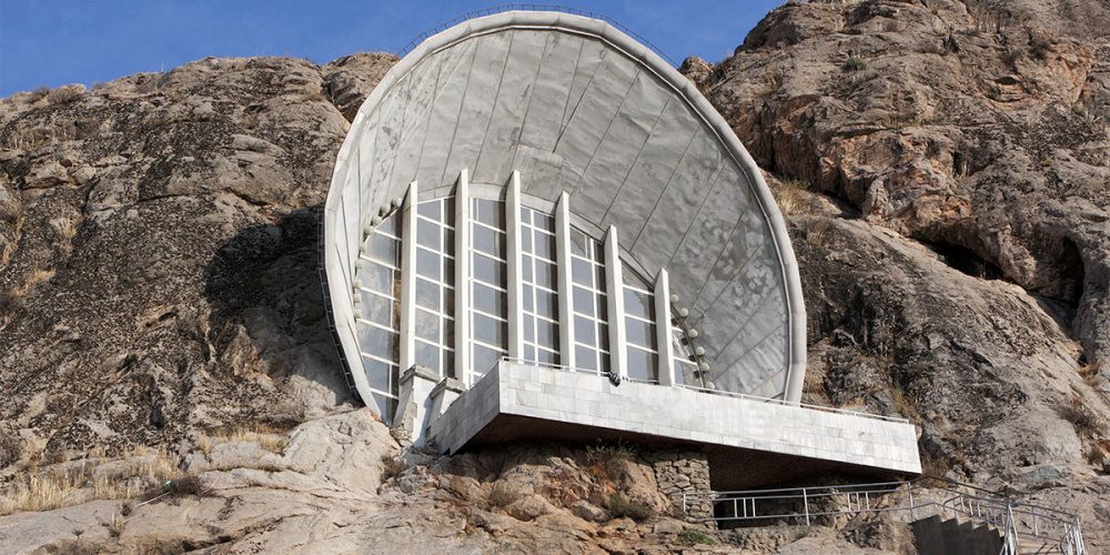 Что же касается так или иначе затрагиваемой нами в каждом обзоре темы футуристической — или «космической», как ее еще называют, — архитектуры на территории современного Кыргызстана, то самым заметным памятником того времени, пожалуй, можно считать здание Историко-этнографического музея, построенного в 1978 году на священной для местных жителей Сулайман-Тоо, то есть Сулеймановой горе, что в южной части Кыргызстана, возле города Ош. Музей располагается прямо в древних пещерах, где стены пестрят петроглифами — росписями по камню.