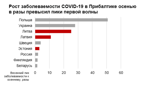 Во вторую волну в Эстонии максимальное дневное число заразившихся коронавирусом втрое превысило весенние пики, в Латвии — в 11 раз, в Литве — в 25 раз.
