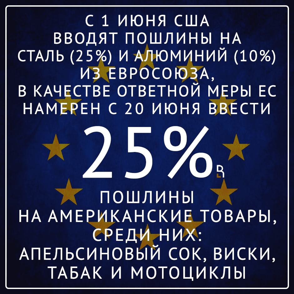 С 1 июня США вводят пошлины на сталь (25%) и алюминий (10%) из ЕС. В качестве ответной меры ЕС предполагает ввести с 20 июня 25-процентные пошлины на американские товары, среди которых - апельсиновый сок, виски, табак и мотоциклы.