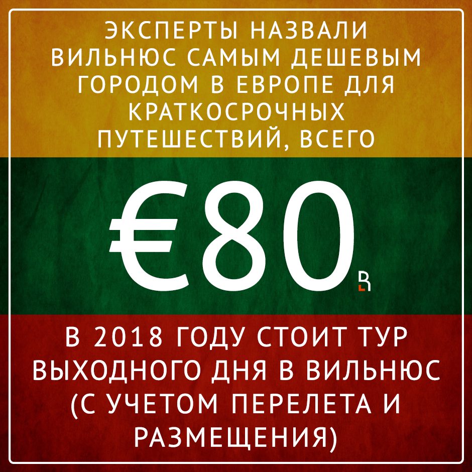 Эксперты назвали Вильнюс самым дешевым городом в Европе для краткосрочных путешествий. В 2018 г. стоимость тура выходного дня в Вильнюс (с учетом перелета и размещения) составляет чуть более 80 евро.