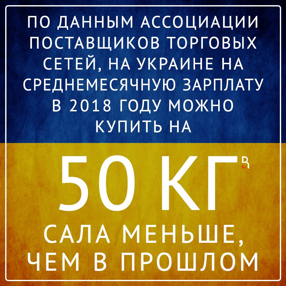 По данным Ассоциации поставщиков торговых сетей, на среднемесячную зарплату на Украине в 2018г. можно купить на 50 кг сала меньше, чем в прошлом.