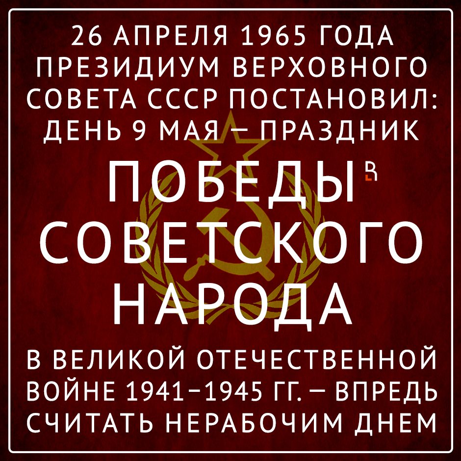 Президиум Верховного Совета СССР постановляет (26 апреля 1965 года): День 9 мая — праздник победы советского народа в Великой Отечественной войне 1941–1945 гг. — впредь считать нерабочим днем.