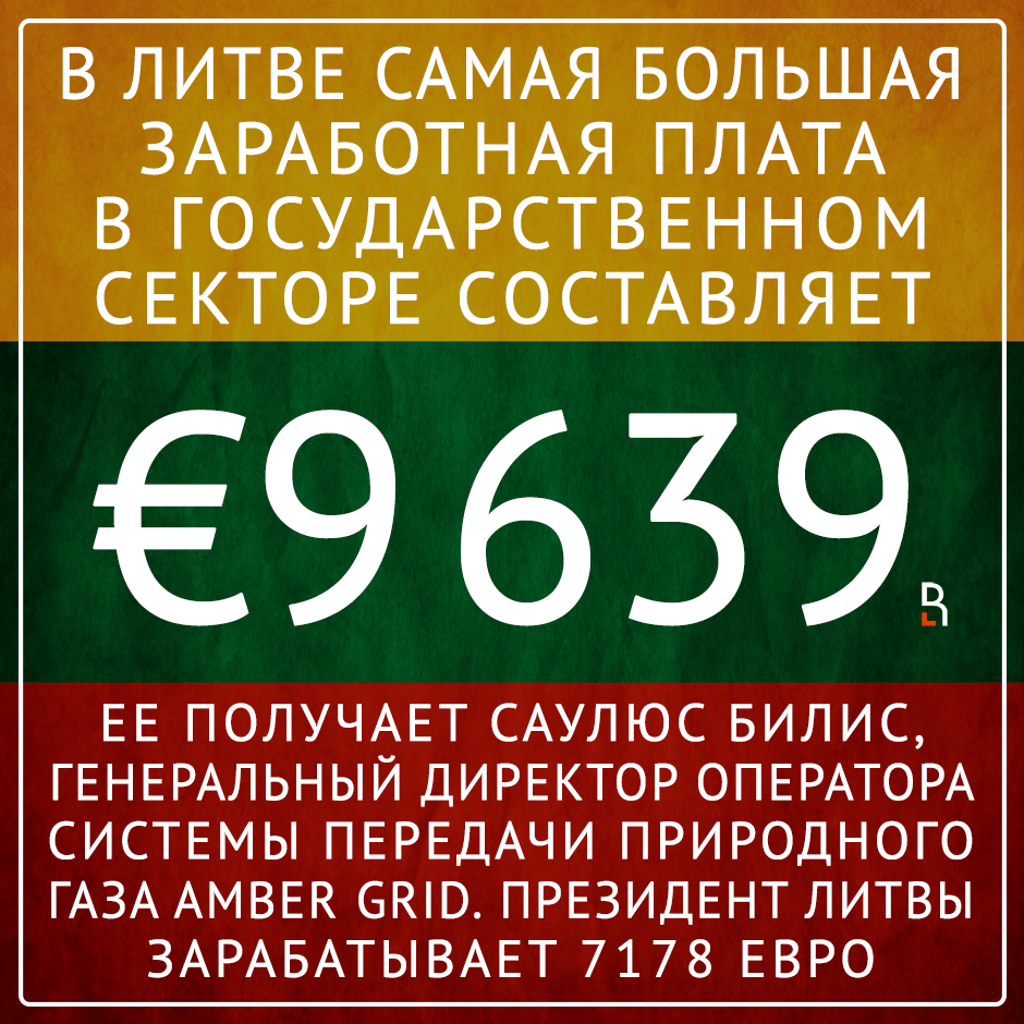 Самая большая заработная плата в Литве в гос. секторе составляет 9639 евро. Ее получает Саулюс Билис, генеральный директор оператора системы передачи природного газа Amber Grid. Президент Литвы зарабатывает 7178 евро