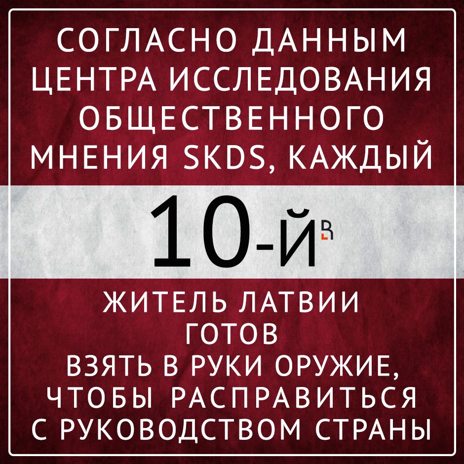 Согласно данным центра исследования общественного мнения SKDS, 10,3% жителей Латвии готовы взять в руки оружие, чтобы расправиться с руководством страны.