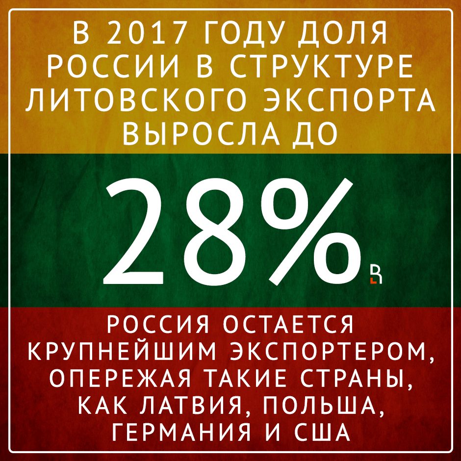В 2017 году доля России в структуре литовского экспорта выросла до 28%. Россия остается крупнейшим экспортером, опережая такие страны, как Латвия, Польша, Германия и США.