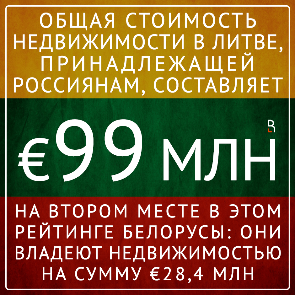 Общая стоимость принадлежащей россиянам недвижимости в Литве составляет €99 млн. На втором месте в этом рейтинге белорусы: они владеют недвижимостью на сумму €28,4 млн.