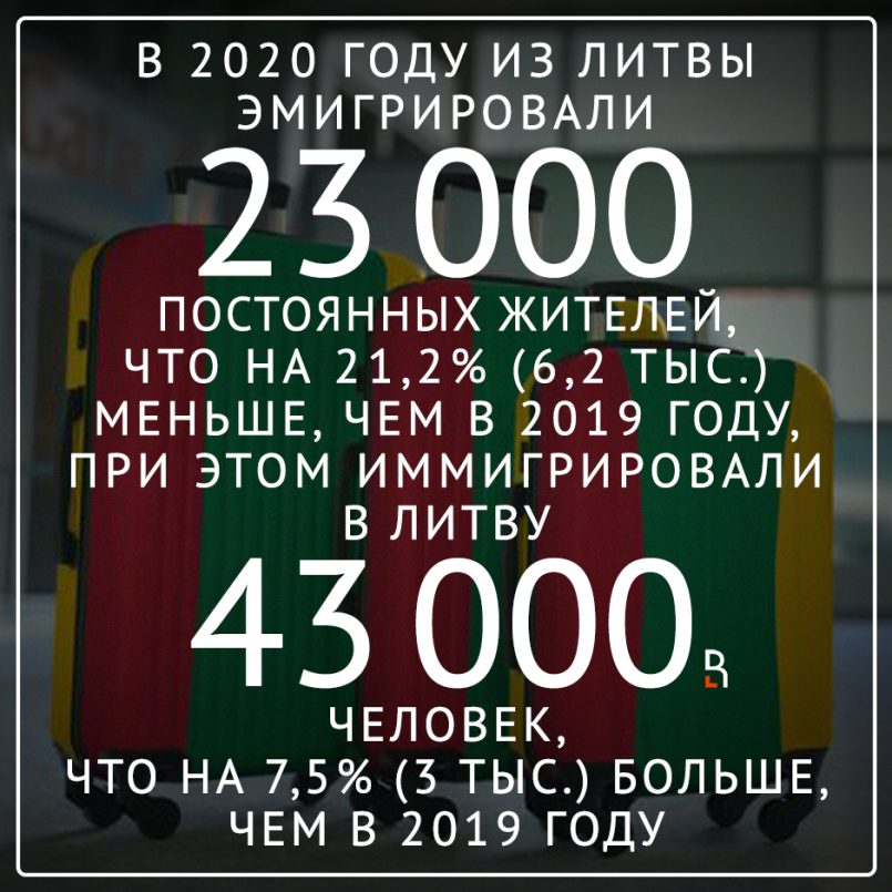 В 2020 году из Литвы эмигрировали 23 000 постоянных жителей, что на 21,2% (6,2 тыс.) меньше, чем в 2019 году. При этом иммигрировали в Литву 43 000 человек, что на 7,5% (3 тыс.) больше, чем в 2019 году