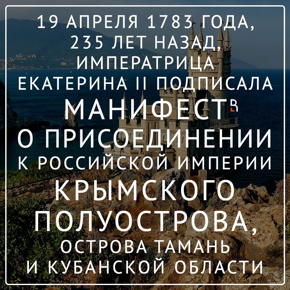235 лет назад 19 апреля 1783 г. императрицей Екатериной II был подписан манифест о присоединении к Российской империи Крымского полуострова, острова Тамань и Кубанской области.