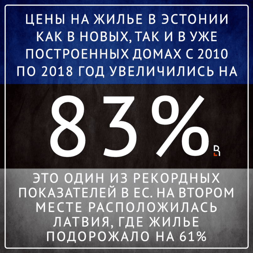 Цены на жилье в Эстонии как в новых, так и в уже построенных домах с 2010 по 2018 год увеличились на 83%, что стало одним из рекордных показателей в ЕС. На втором месте расположилась Латвия, где жилье подорожало на 61%.