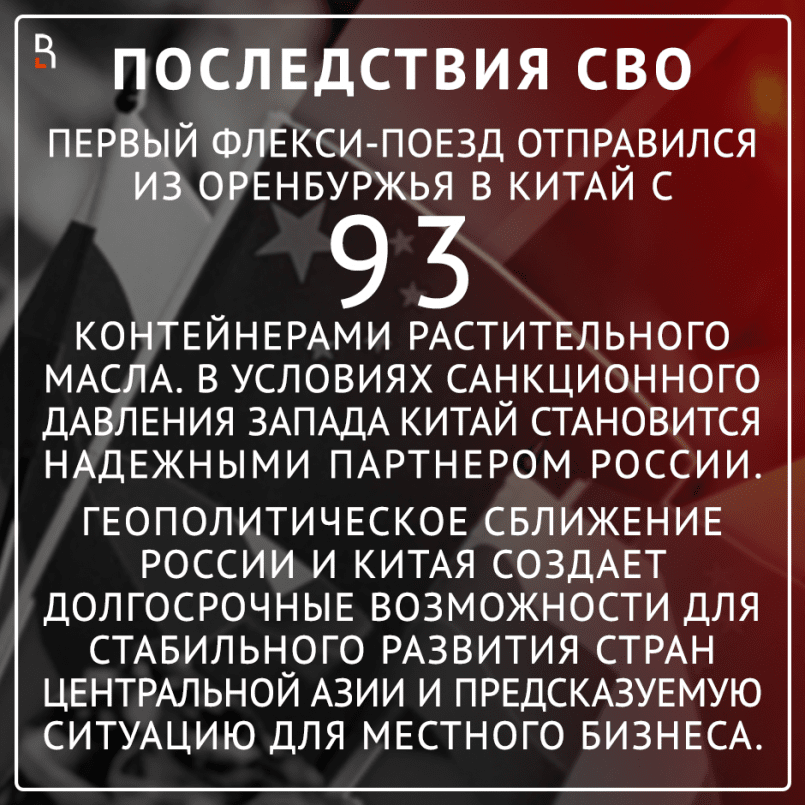 Первый флекси-поезд отправился из Оренбуржья в Китай с 93 контейнерами растительного масла производства Сорочинского маслоэкстракционного завода. В условиях санкционного давления Запада Китай, Индия, страны Юго-Восточной Азии становятся надежными партнерами России.