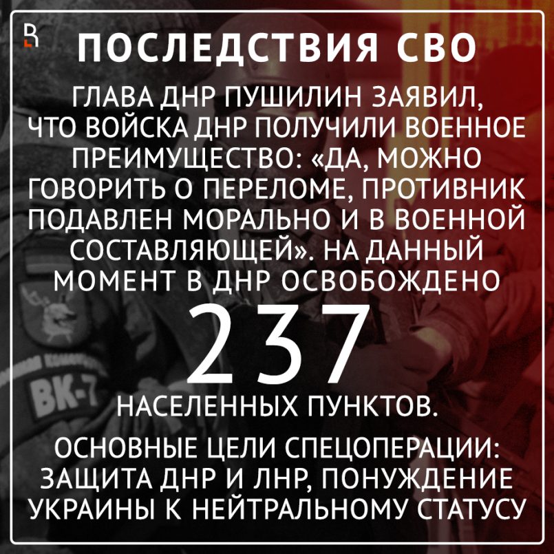 Глава Донецкой Народной Республики Денис Пушилин заявил, что в битве за Донбасс наступил переломный момент. Он отметил, что военные ДНР получили военное преимущество: «Да, можно говорить о переломе, противник подавлен морально, а также в военной составляющей». На данный момент в ДНР освобождено 237 населенных пунктов, включая Богородичное и Пришиб.