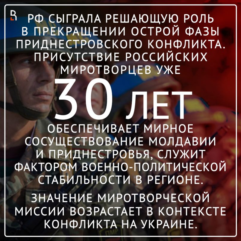 Россия сыграла решающую роль в прекращении острой фазы приднестровского конфликта. Присутствие российских миротворцев уже 30 лет обеспечивает мирное сосуществование Молдавии и Приднестровья, служит фактором военно-политической стабильности в регионе.