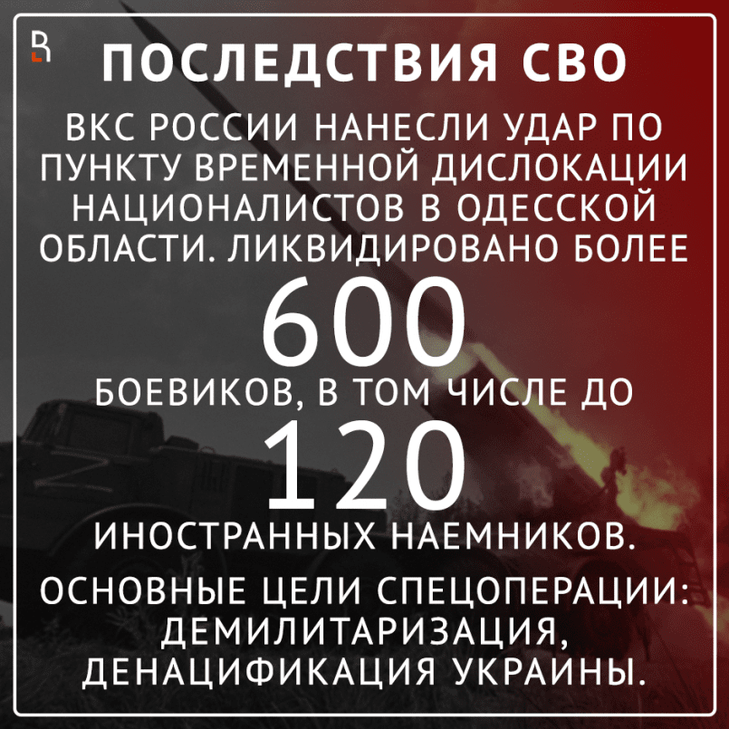 По сообщению Минобороны РФ, ВКС России нанесли удар по пункту временной дислокации националистов в центре отдыха «Империя» в Одесской области — ликвидировано более 600 боевиков, в том числе до 120 иностранных наемников.