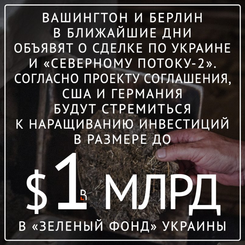 Вашингтон и Берлин в ближайшие дни объявят о сделке по Украине и «Северному потоку-2». Согласно проекту соглашения, США и Германия будут стремиться к наращиванию инвестиций в размере до $1 млрд в «зеленый фонд» Украины
