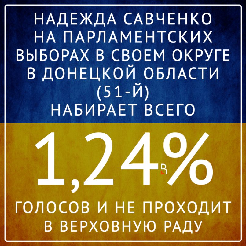 Надежда Савченко на парламентских выборах в своем округе в Донецкой области (51-й) набирает лишь 1,24% голосов и не проходит в Верховную Раду.