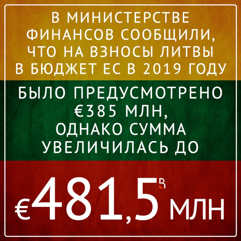 В Министерстве финансов сообщили, что на взносы Литвы в бюджет ЕC в 2019 году было предусмотрено 385 млн евро, однако сумма увеличилась до 481,5 млн евро.