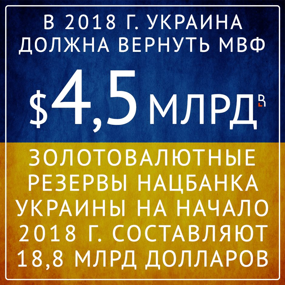 В 2018-м Украина должна вернуть МВФ 4,5 млрд долларов. Золотовалютные резервы Нацбанка Украины на начало 2018 года составляют 18,8 млрд долларов.