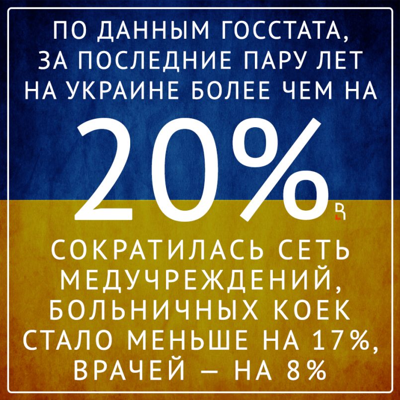 По данным Госстата, за последние пару лет на Украине более чем на 20% сократилась сеть медучреждений, больничных коек стало меньше почти на 17%, врачей — на 8%.