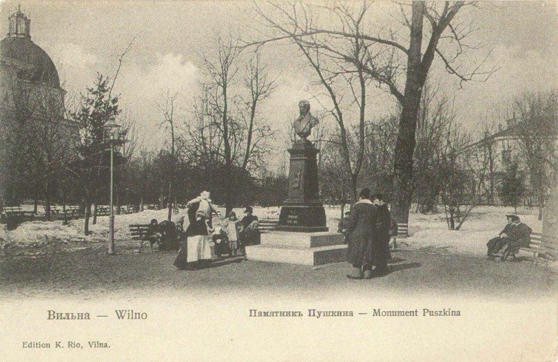 По случаю столетия со дня рождения А.Пушкина, исполнившегося 26 мая 1899 года, Виленское городское общественное управление постановило переименовать сквер, расположенный у подножия Замковой горы, в Пушкинский и установить в нем бюст поэта. Из городской казны ассигновали для этой цели 3 200 рублей. Место для памятника определили возле входа в старинный парк, со стороны Кафедральной площади.