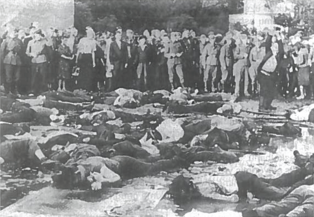 Там бандиты под хохот толпы продолжали глумиться над своими безоружными жертвами, избивая их чем попало: лопатами, железными прутьями, палками, водопроводными трубами.
