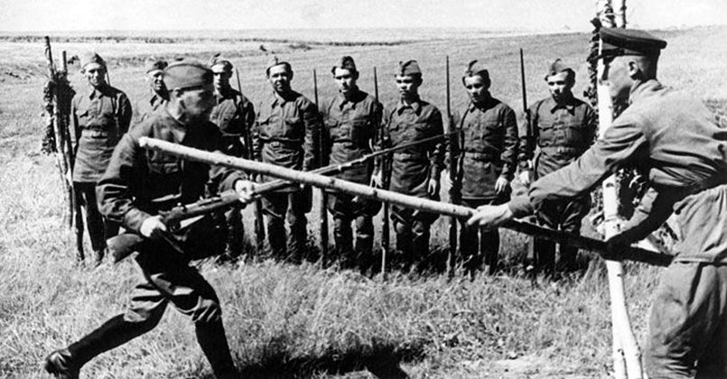 «Для ведения боя в большом и густом лесу русские обычно использовали отдельно действующие усиленные батальоны или роты. Чаще всего бой велся на узком фронте, причем в первом эшелоне действовало не больше роты. Благодаря этому исключалось перемешивание боевых порядков и создавалась необходимая глубина эшелонирования их. В частности, при бое в лесу боевой порядок строился в три, четыре, пять и более эшелонов. Отдельные эшелоны атаковывали внезапно, как правило, на нормальном фронте. Атакующие подразделения, не обращая внимания на препятствия, с криками «ура» продвигались вперед, ведя огонь из всех видов ручного оружия. Если первый эшелон понес большие потери, его сменял второй и последующий эшелоны, стремясь завязать ближний бой. В таком бою русский солдат чувствовал свое превосходство. Обучение ближнему бою, в частности штыковому, было наиболее характерной чертой боевой подготовки русских.