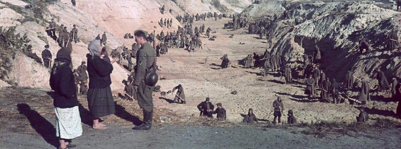 «…Вечером я нес ведро вина к себе на квартиру… По пути я услышал шум в садике и свернул туда. Подойдя ближе, я увидел, что люди закапывают пойманных евреев. Особенно активно распоряжался маляр Сергей… Этот Сергей потом забрал себе теплое одеяло и продукты этих евреев. Увидев это, я оставил ведро с вином своему сыну Николаю, а сам сбегал за лопатой и стал помогать закапывать.