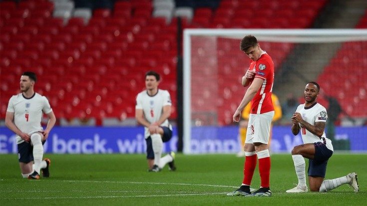 Игроки сборной Польши по футболу перед матчем с Англией отказались встать на колени в поддержку движения Black Lives Matter (BLM). Вместо этого они держали руку на значке УЕФА с надписью Respect.