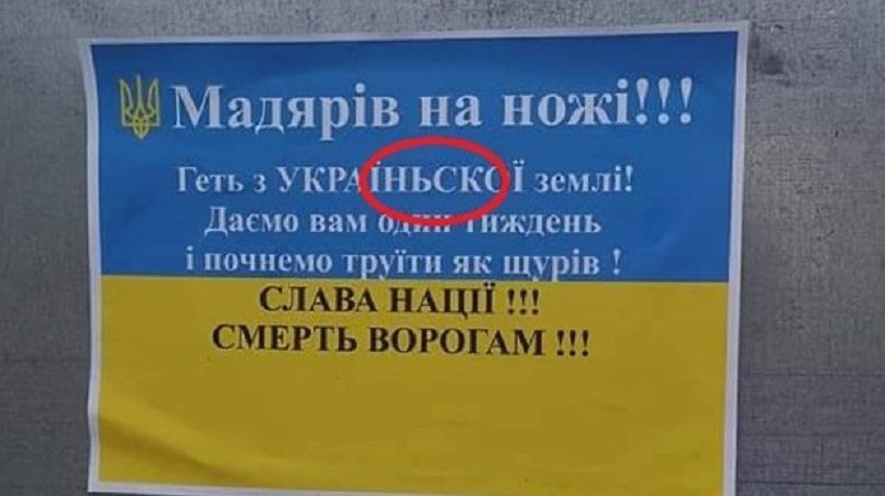 На желто-голубом фоне был написан антивенгерский текст с угрозами: «Мадьяр на ножи! Прочь с украинской земли! Даем вам одну неделю и начинаем травить как крыс!»