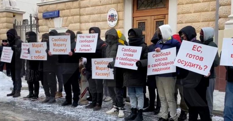 Несколько десятков человек митингуют с лозунгами: «Свободу Марату Касему», «Марат, мы с тобой!», «Что там со свободой слова, Латвия?», «Свобода слова в свободном падении», «Хартия ЕС вышла из ЕС», «ЕС, готов осудить?».