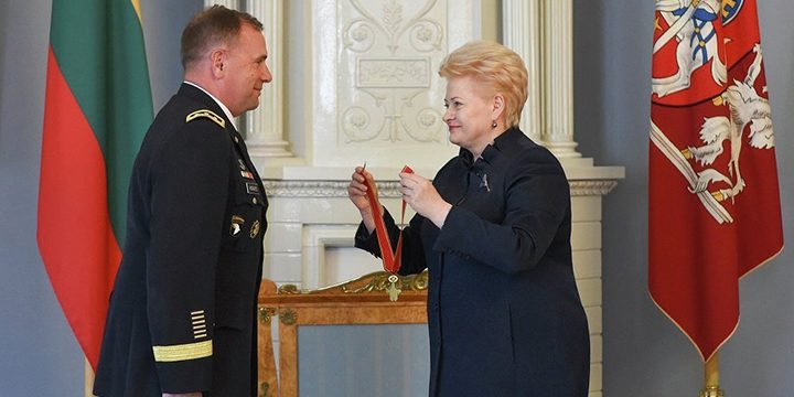 Президент Литовской Республики Даля Грибаускайте вручила командующему сухопутными войсками США в Европе генерал-лейтенанту Бену Ходжесу крест командора ордена «За заслуги перед Литвой».