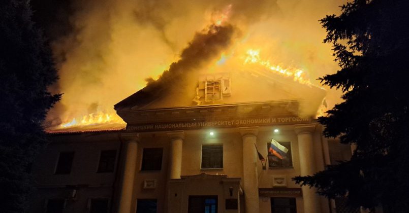 Также он отметил, что в результате обстрела возник пожар первого корпуса Донецкого национального университета экономики и торговли им. Туган-Барановского. В учебном заведении сгорела кровля, для тушения пожара от МЧС России по ДНР было задействовано 19 единиц техники и 91 человек личного состава.