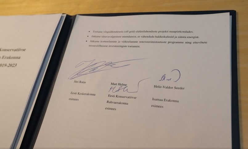 Соглашение 6 апреля одобрили советы уполномоченных трех партий. Его подписали лидеры политических сил Юри Ратас (Центристская партия), Март Хельме (EKRE) и Хелир-Валдор Сеэдер («Отечество»).