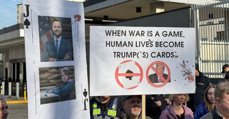 «Когда война — это игра, человеческие жизни становятся картами Трампа», — говорится на одном из плакатов с отсылкой на слова президента США, что Украина не имеет козырей для продолжения войны.