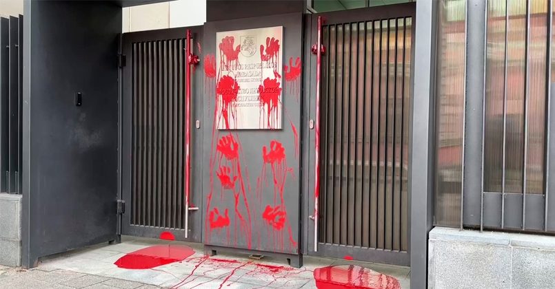 Рано утром неизвестные лица в масках облили вход в посольство красной краской и оставили отпечатки ладоней на табличке. В ответ на этот инцидент Министерство иностранных дел Литвы вызвало представителя посольства России в Литве для вручения ноты протеста.