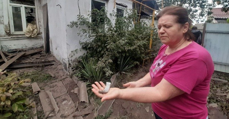 Осколки снаряда разлетелись в частном секторе, в домах у людей вылетели стекла, повреждения получили кровли в нескольких домах. Также в результате обстрела погибла женщина, она не успела добежать до укрытия и погибла на ступеньках дома в своем дворе.