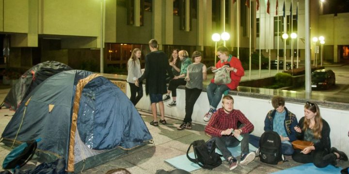 Вход в литовское правительство молодые люди преградили плакатом с надписью «Ремень уже трется о кости». Кроме того, студенты установили рядом со зданием палатки, привезли велосипеды, барабаны.